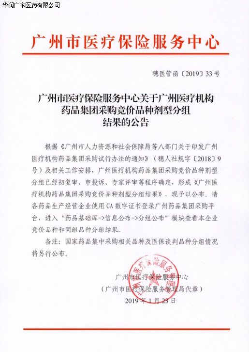 華潤廣東醫(yī)藥有限公司關(guān)于廣州醫(yī)療機(jī)構(gòu)藥品集團(tuán)委托集中議價(jià)結(jié)果公布及合同簽訂的通知
