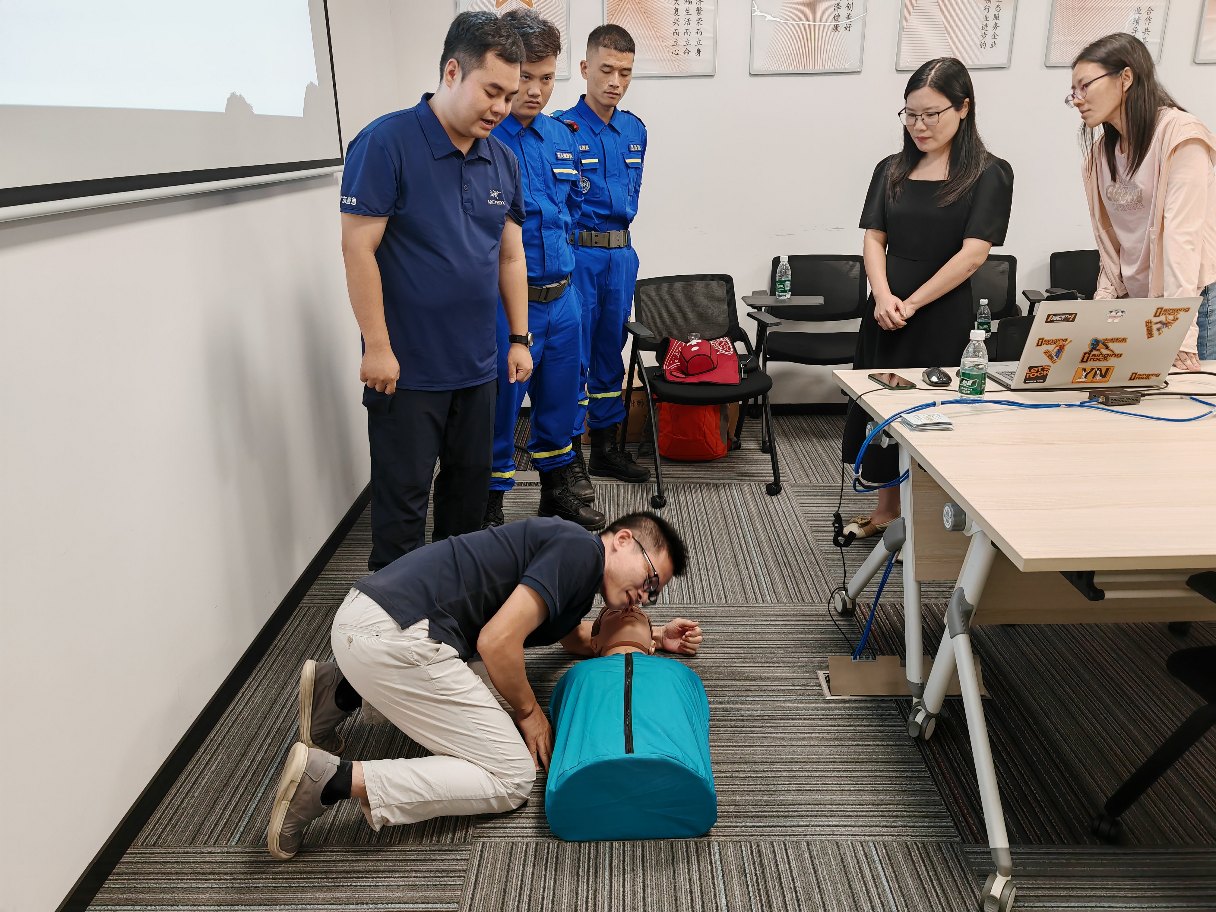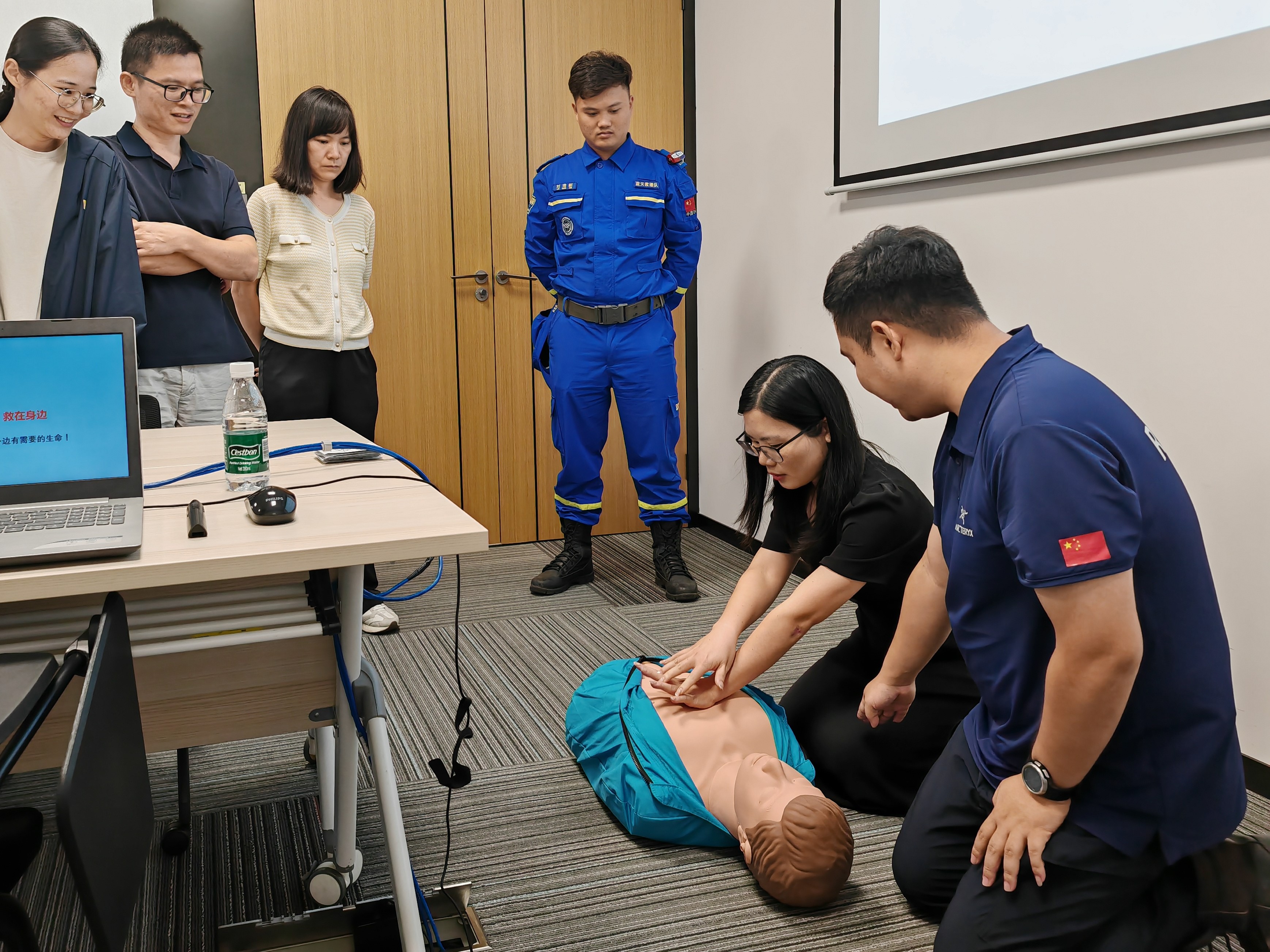此次培訓(xùn)由藍(lán)天救援隊(duì)毛成講師主講,4名救援隊(duì)員協(xié)助實(shí)操教學(xué)。培訓(xùn)主要圍繞火災(zāi)逃生、心肺復(fù)蘇、海姆立克急救法三個(gè)主題展開。毛老師通過專業(yè)知識(shí)講授、實(shí)際案例分析、動(dòng)手實(shí)操演練等形式多樣、內(nèi)容豐富的授課向大家詳細(xì)講解了滅火器的使用、徒手心肺復(fù)蘇操作步驟、AED的使用、應(yīng)急止血包扎方法及海姆立克急救方法,反復(fù)強(qiáng)調(diào)了應(yīng)急救護(hù)“黃金四分鐘”的重要性。為了讓大家更加直觀掌握應(yīng)急救護(hù)要領(lǐng),老師邀請大家分組實(shí)操心肺復(fù)蘇胸外按壓及海姆立克急救法。
