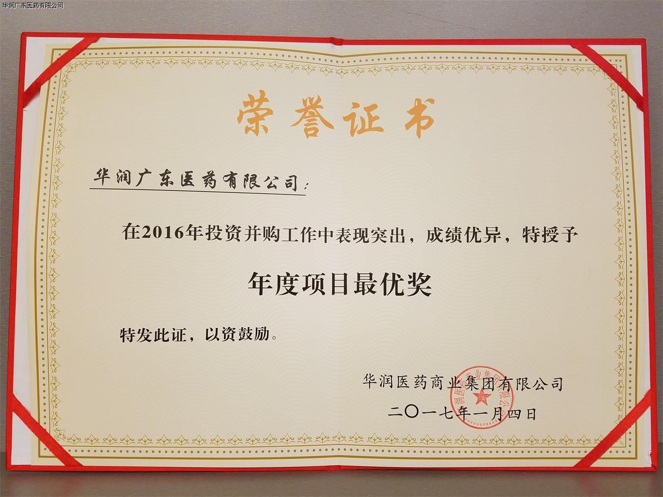 2017年1月4日,在濟(jì)南召開的“華潤(rùn)醫(yī)藥商業(yè)2017年投資并購(gòu)工作會(huì)議”上,華潤(rùn)廣東醫(yī)藥有限公司(以下簡(jiǎn)稱“華潤(rùn)廣東醫(yī)藥”)榮獲了華潤(rùn)醫(yī)藥商業(yè)集團(tuán)頒發(fā)的投資并購(gòu)項(xiàng)目“年度項(xiàng)目最優(yōu)獎(jiǎng)”的榮譽(yù)。