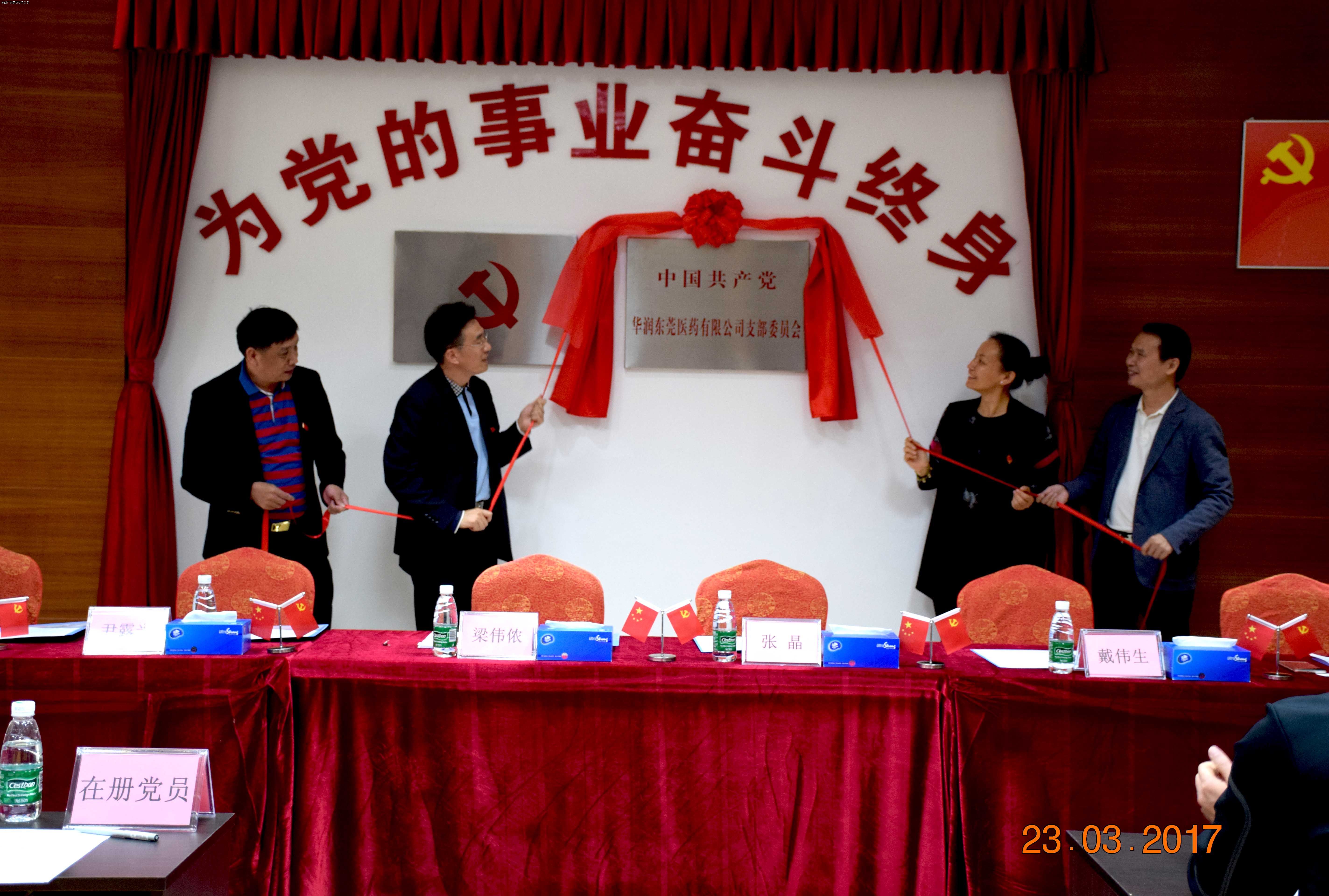2017年3月23日上午,華潤東莞醫(yī)藥有限公司(以下簡稱“華潤東莞醫(yī)藥”)在黨員活動室舉辦黨支部揭牌儀式并召開黨員選舉大會。寮步鎮(zhèn)鎮(zhèn)委委員梁偉儂、寮步鎮(zhèn)西溪村黨工委書記尹露光、寮步鎮(zhèn)社會組織工委副書記鄺紹坤、華潤廣東醫(yī)藥有限公司紀(jì)檢委員張晶、華潤東莞醫(yī)藥總經(jīng)理戴偉生等領(lǐng)導(dǎo)共同出席活動。本次活動由華潤東莞醫(yī)藥顏加進同志主持,公司全體黨員及公司全體中、高層管理人員,華潤廣東醫(yī)藥黨務(wù)工作者作為列席嘉賓出席本次活動。
