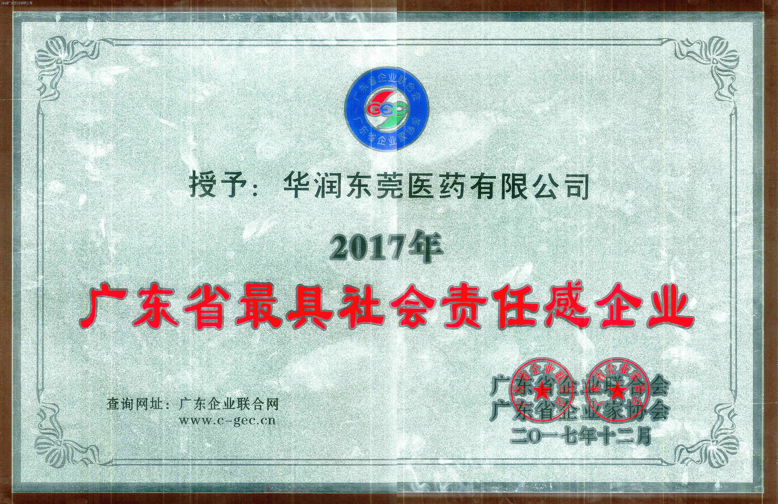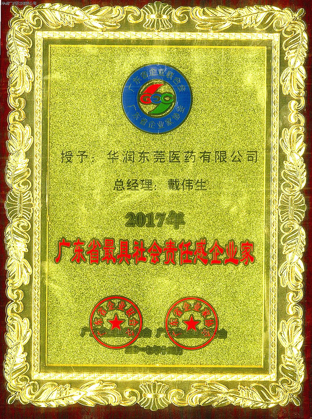 2017年12月21日,由廣東省企業(yè)聯(lián)合會(huì)、廣東省企業(yè)家協(xié)會(huì)主辦的“2017廣東企業(yè)家年會(huì)”在廣州隆重舉行。年會(huì)以“新時(shí)代 新責(zé)任 新征程”為主題,號(hào)召全省企業(yè)家以黨的十九大精神為指引,立足新時(shí)代,凝聚新力量,開啟新征程。全省企業(yè)家代表、部分行業(yè)協(xié)會(huì)商會(huì)、各地企聯(lián)負(fù)責(zé)人約600人出席了會(huì)議。華潤東莞醫(yī)藥有限公司(以下簡稱“華潤東莞醫(yī)藥”)榮獲“2017年廣東省最具社會(huì)責(zé)任感企業(yè)”稱號(hào),公司總經(jīng)理戴偉生先生榮獲“2017年廣東省最具社會(huì)責(zé)任感企業(yè)家”稱號(hào)。