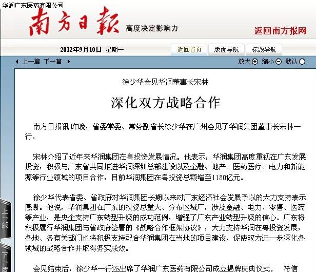 當(dāng)日徐少華代表省委、省政府對華潤集團(tuán)長期以來對廣東經(jīng)濟(jì)社會(huì)發(fā)展予以的大力支持表示感謝。他說,華潤集團(tuán)在廣東的投資總量大、分布區(qū)域廣、涉及金融、電力、零售、醫(yī)藥等產(chǎn)業(yè),是央企支持廣東轉(zhuǎn)型升級(jí)的成功范例,增強(qiáng)了廣東產(chǎn)業(yè)轉(zhuǎn)型升級(jí)的信心。廣東將積極履行華潤集團(tuán)與省政府簽署的《戰(zhàn)略合作框架協(xié)議》,大力支持華潤在粵投資發(fā)展,各地、各有關(guān)部門也將積極支持配合華潤集團(tuán)在當(dāng)?shù)氐捻?xiàng)目建設(shè),促使雙方進(jìn)一步深化各領(lǐng)域的戰(zhàn)略合作并取得務(wù)實(shí)成效。會(huì)見結(jié)束后,徐少華一行還出席了華潤廣東醫(yī)藥有限公司成立揭牌慶典儀式。