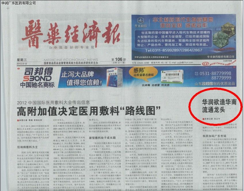 2012年9月9日,華潤醫(yī)藥商業(yè)集團(tuán)、廣東中健醫(yī)藥有限公司合作成功暨華潤廣東醫(yī)藥有限公司成立揭牌慶典在廣州萬達(dá)希爾頓隆重舉行。本次活動(dòng)受到了華潤集團(tuán)的重視和廣東省政府的關(guān)注與支持,廣東衛(wèi)視、中國醫(yī)藥報(bào)、醫(yī)藥經(jīng)濟(jì)報(bào)、南方日報(bào)、廣州日報(bào)、羊城晚報(bào)等知名媒體前來慶賀并報(bào)道了本次慶典。