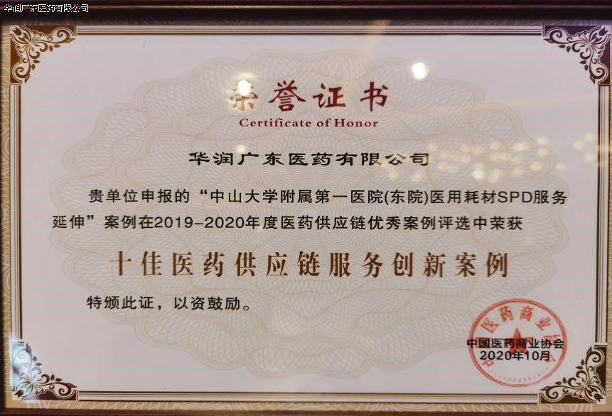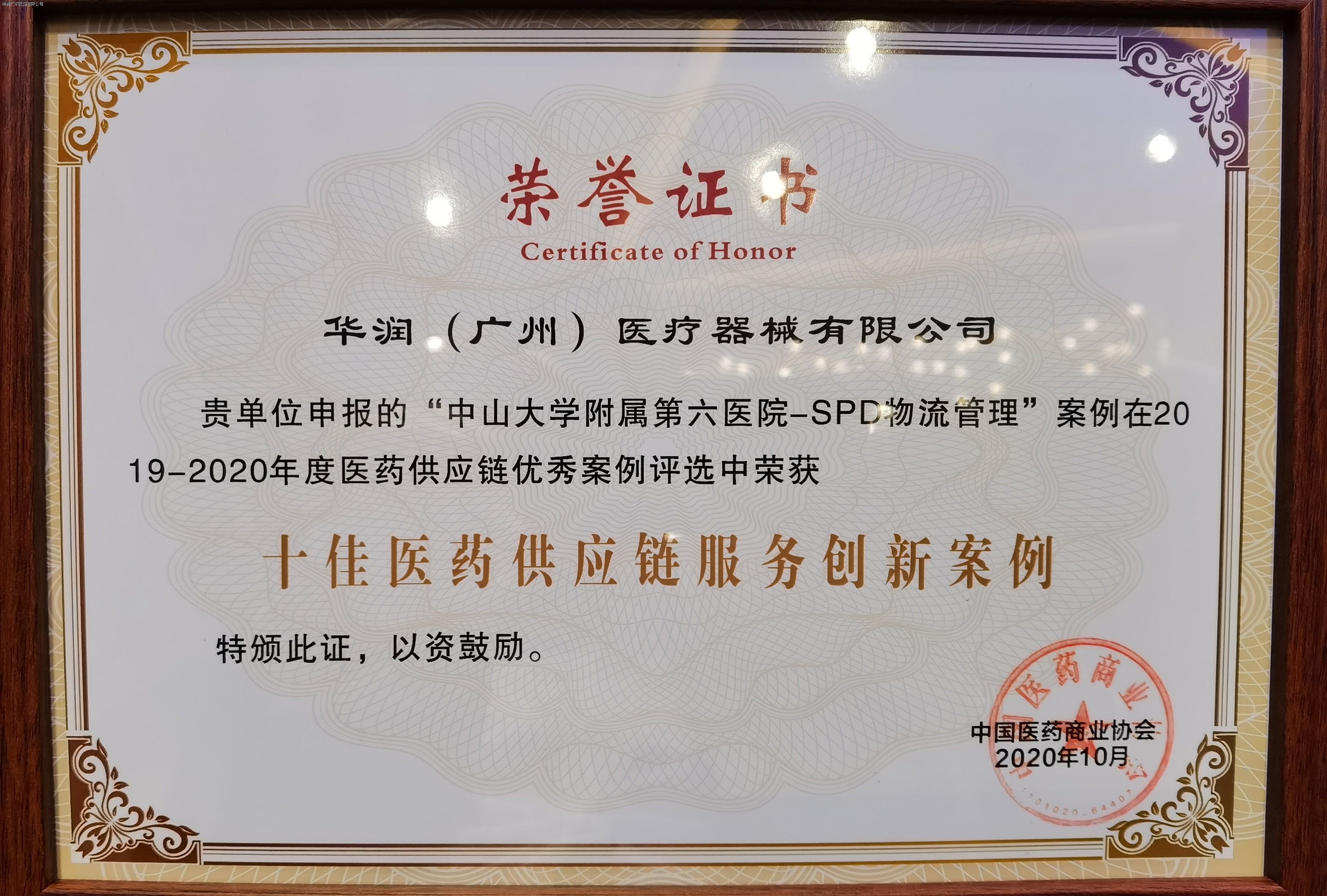 2020年10月30日,在廣州中心皇冠假日酒店舉行了2020年第五屆中國醫(yī)藥供應(yīng)鏈大會(huì)。華潤廣東醫(yī)藥有限公司、華潤(廣州)醫(yī)療器械有限公司申報(bào)“醫(yī)藥耗材SPD服務(wù)延伸”案例,在2019年-2020年度醫(yī)藥供應(yīng)鏈優(yōu)秀案例評(píng)選中,榮獲中國醫(yī)藥商業(yè)協(xié)會(huì)頒發(fā)的《十佳醫(yī)藥供應(yīng)鏈服務(wù)創(chuàng)新案例》獎(jiǎng)項(xiàng)。